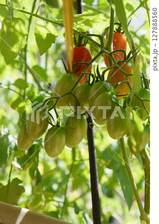 真夏の家庭菜園で育てる夏野菜 アイコ種,ミニトマトの実(プチトマト) - 生育途中
