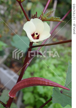 Flower of "Okra" 真夏の家庭菜園で育てる夏野菜,オクラの花 (クローズアップ接写)