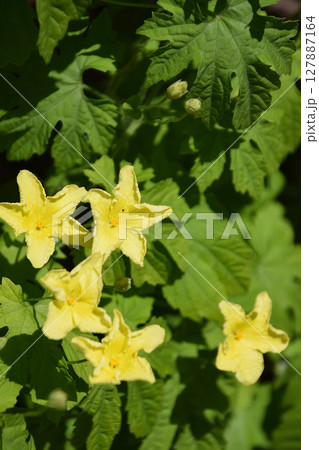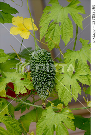 Bitter melon 真夏の家庭菜園で育てる夏野菜,ゴーヤ(ゴーヤー)の花,広角ワイド・全体撮り