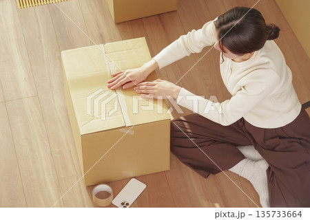 引越しの荷物整理をする若い女性