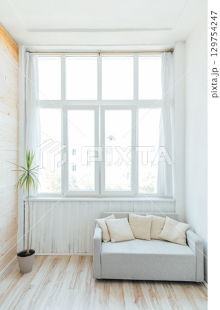 Interior of an empty room with a window and a sofa with a green plant