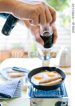 男性 庭キャンプ 朝食