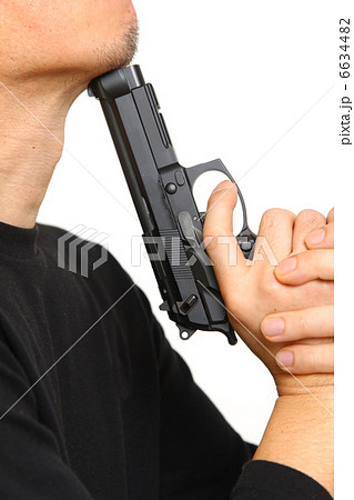 玩具の拳銃を口に含んで自殺する男性のイメージ