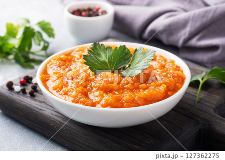 Homemade caviar from zucchini tomatoes and onions in a ceramic plate, on a gray background. Homemade production canning, canned stewed vegetable.