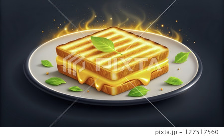 Delicious melted cheese sandwich on a plate with fresh basil leaves, showcasing a golden brown crust and inviting aroma