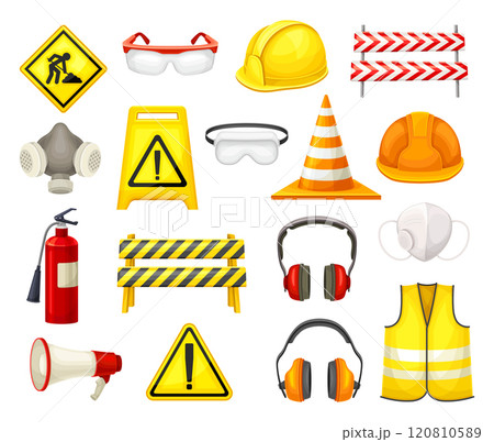 Security equipment. Protection accessories, safety clothes, masks and helmets, caution gloves, glasses and boots, fire extinguisher and warning sign qualitative vector cartoon isolated set