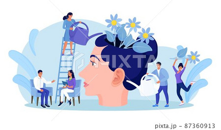 Mental health. Tiny people watering human head with flowers inside. Characters healing mind, soul for happy lifestyle. Psychology. Positive thinking, self care. Wellbeing, acceptance, blooming brain