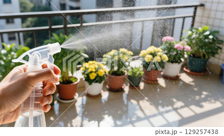 Hand spraying water on potted flowers on a sunny balcony, capturing daily plant care and urban gardening lifestyle.