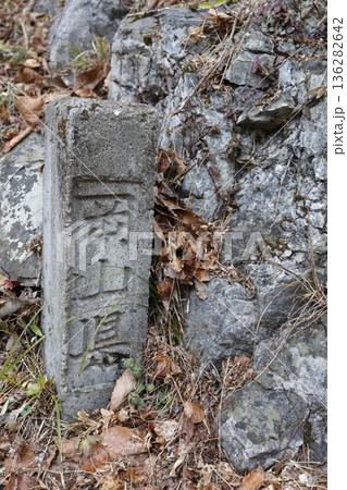 山林の道端に立つ境界標。岡山県。