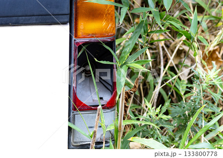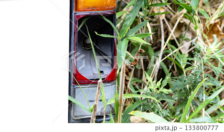 山林放置されているテールランプが割れている放置自動車