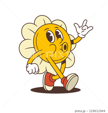 Retro Flower Character Walking With Confident Smile And Pointing Upward In Gesture Vector Illustration
