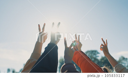 Peace sign, support and hands of friends in nature for community, motivation and teamwork. Partnership, relax and hand gesture with people in outdoors for collaboration, diversity and solidarity