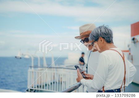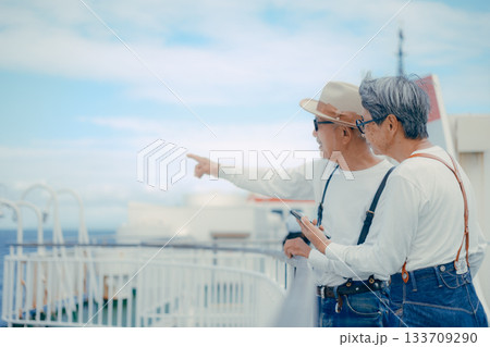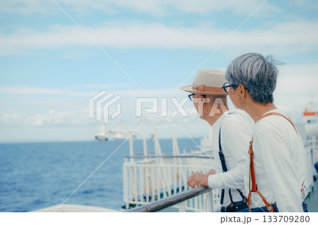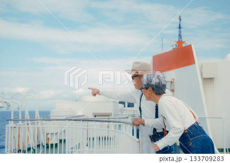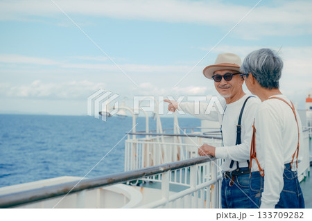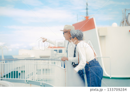 シニア夫婦が船上デッキで景色を指さす旅行シーン