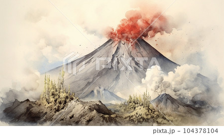 火山噴火:活火山が噴火している様子の水彩画