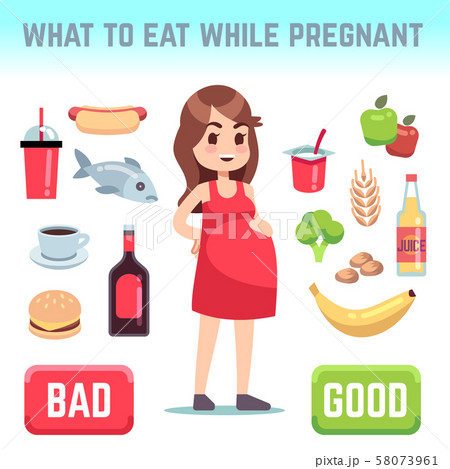 Pregnant woman dieting. Bad and good food during pregnancy. Pregnant family diet vector infographic