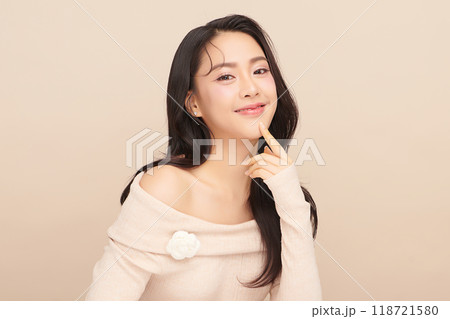 Beautiful young asian woman with clean fresh skin on beige background, Face care, Facial treatment, Cosmetology, beauty and spa, Asian women portrait.