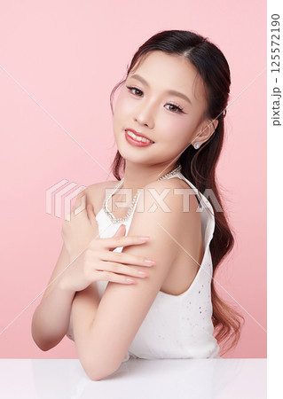 Beautiful young asian woman with clean fresh skin on pink background, Face care, Facial treatment, Cosmetology, beauty and spa, Asian women portrait.