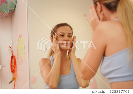 Young woman in a modern bathroom washing her face and brushing her teeth