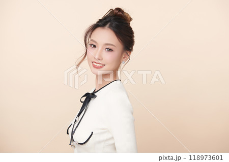 Beautiful young asian woman with clean fresh skin on beige background, Face care, Facial treatment, Cosmetology, beauty and spa, Asian women portrait.