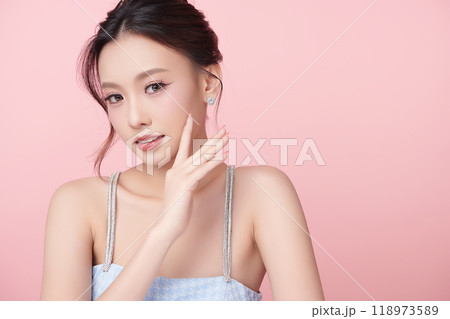 Beautiful young asian woman with clean fresh skin on pink background, Face care, Facial treatment, Cosmetology, beauty and spa, Asian women portrait.