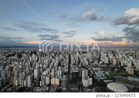 Birds eye view of Sao Paulo skyline with dramatic clouds at sunset