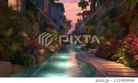 Illuminated pathway with garden lighting and flourishing vegetation enhances outdoor ambiance