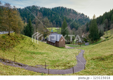 Scenic Countryside Landscape with a Small Brick Chapel and Traditional Houses in a Green Valley of the Black Forest, Germany