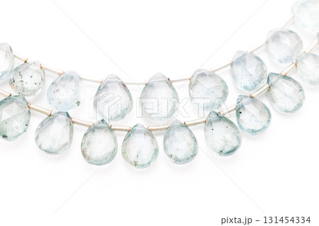 白背景に並べられたモスアクアマリンのファセットドロップカット
