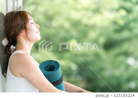 森・公園でヨガマットを持って深呼吸・森林浴する女性(ヨガ・ピラティス・ヘルスケア・リフレッシュ)