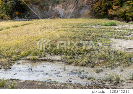 豪雨災害で土砂が流れ込んだ秋の水田