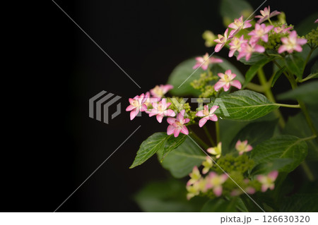 黒背景に浮かぶガクアジサイの蕾と装飾花