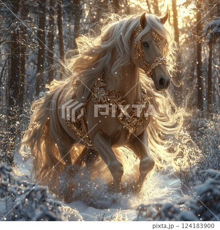 Majestic golden horse galloping in a snowy forest under golden sunlight