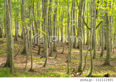 初秋の岳岱自然観察教育林 ブナ二次林の列と薄緑の葉(白神山地)
