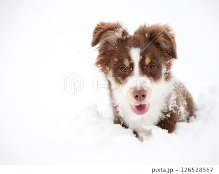 Brown and white dog is laying in the snow