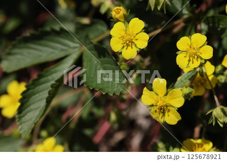 自然 植物 キジムシロ、バラ科の多年草。葉は奇数羽状複葉、先端の三枚の小葉が目立つ