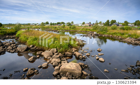 Serene river landscape with rocks, grass, and distant village under a blue sky by White Sea in Karelia, nature of Russia