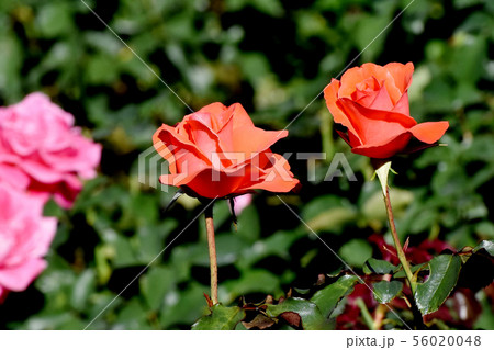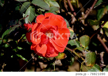 調布市の植物園に咲く朱色のバラ グロアール・ドゥ・ミディ(モダンローズ)
