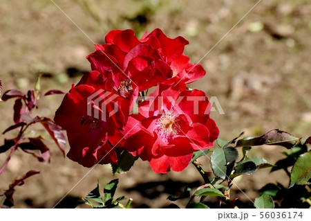 調布市深大寺元町の植物園に咲く赤いバラ(モダンローズ 花房)の花