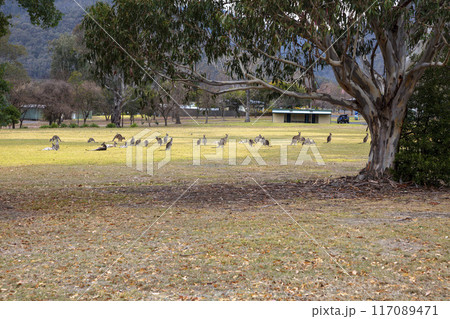 Australian Kangaroos relaxing in a large grassy field in the Snowy Mountains