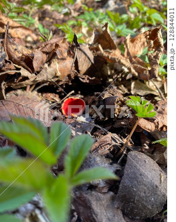 Bright Red Fungi is Peeking Through a Layer of Leaves in a Lush Forest Environment