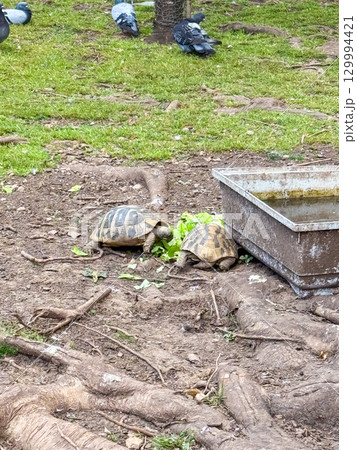 Two turtles feeding on green leaves near a water container. Wildlife, nature, ecology and animal observation in outdoor habitat.