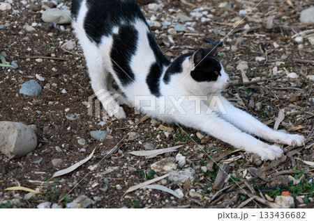 Stretching black and white cat enjoys the warm sun on a gravel pathway in a serene outdoor setting during late afternoon