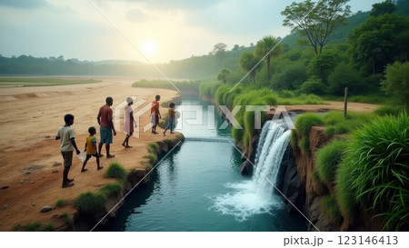 Children Walking by Scenic Waterfall at Sunset