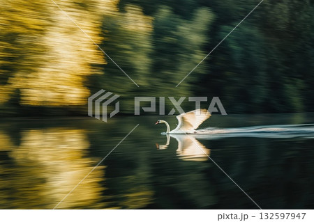 Graceful Swan Skimming Over Calm Water with Reflected Trees in Soft Golden Light