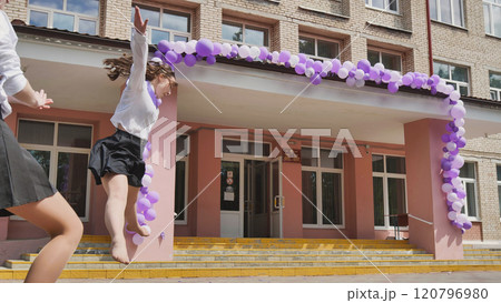 Female students happily leaping in front of the festive school building on the last day of school