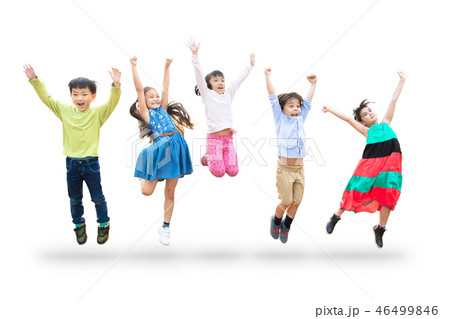 Happy kids jumping together.