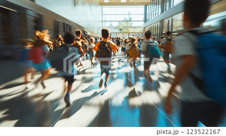 Running in school hallway, diverse children with backpacks enjoying recess time, copy space