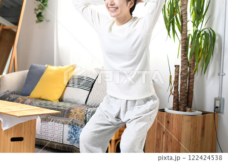 家・ホームジムで背筋を鍛えるパジャマ姿のアジア人女性(バックスクイーズ)