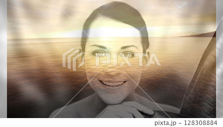 Smiling woman over serene ocean at sunset, creating peaceful image