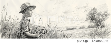 A boy with a straw hat enjoying a serene country landscape, illustrating childhood innocence.